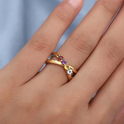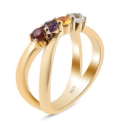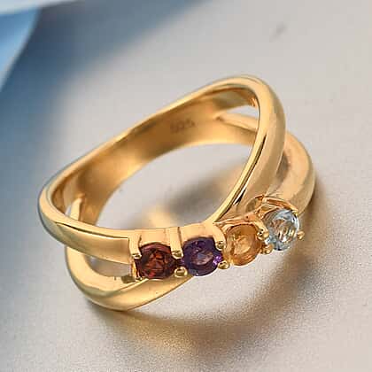 This unique and stylish multi-gemstone criss-cross ring will make heads turn around. It is made from sterling silver with a 14K yellow gold overlay giving it a luxe appeal. It is decorated with four round shape multi-colour gemstones prong set in the frame exhibiting bright sparkle and shine.