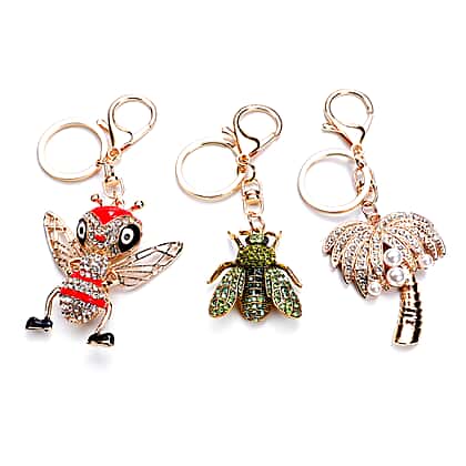 Set of 3 - Simulated Pearl, Multi Colour Austrian Crystal and Multi Gemstone Bee, Beetle and Palm Tree Keychains in Yellow Gold Tone