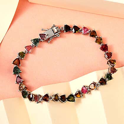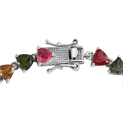 Allure your wrist with the charming hues and comfortable wear of this multi-tourmaline cluster bracelet, and enhance your unique personality with each set of clothes. This tennis-inspired bracelet is crafted using sterling silver and overlaying platinum, creating a bright tone. This bracelet has triangular stations interconnected through links, making mobility around your wrist. The trillion faceted-cut multi-colour tourmalines are pronged on each link. This multi-coloured tourmaline bracelet will become your favourite daily wear.