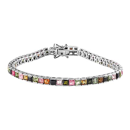 Create a sparkling look by wearing this gorgeous multi-tourmaline bracelet around your wrist. This tennis-inspired bracelet setting features a square multi-colour gemstones channel set with a faceted cut to give out more brilliance and shine. This bracelet is crafted using solid sterling silver overlayed with platinum, adding a brighter tone. You can gift this bracelet to someone born in the month of October.