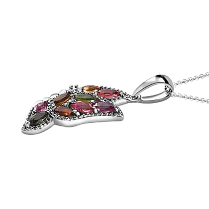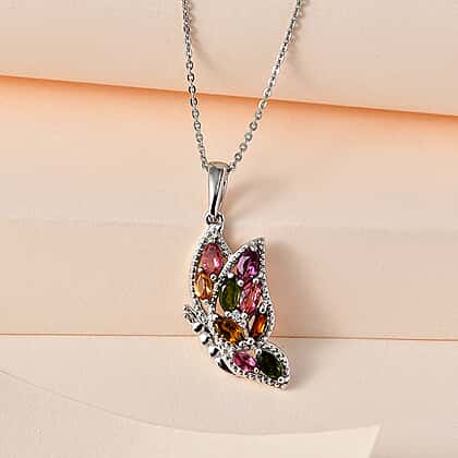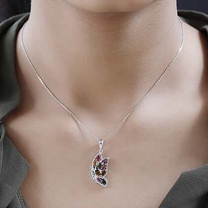 Multi-Tourmaline & Moissanite Butterfly Pendant with Chain (Size 20) in Platinum Overlay Sterling Silver 1.20 Ct.