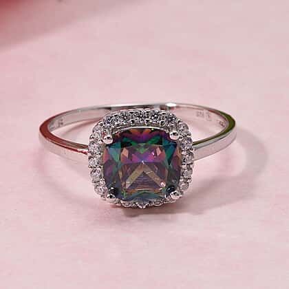 - Features a cushion-cut mystic topaz cubic zirconia with an enchanting allure.