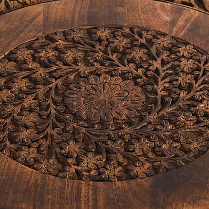 - HAND-CARVED DETAIL:Floral carvings create a scintillating look on this wooden table