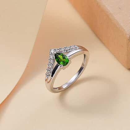in Rhodium Overlay Sterling Silver. A captivating blend of elegance and nature, this Natural Chrome Diopside, Natural White Zircon Crown Ring features a stunning assortment of chrome diopside and sparkling white zircons. The pear-shaped diopside, with its verdant green hue, is a true eye-catcher. The rhodium overlay adds a touch of luxurious sheen to the silver ring.