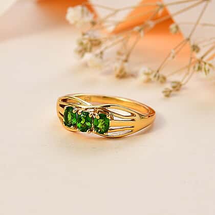 Celebrate timeless elegance and heartfelt symbolism with this Natural Chrome Diopside Trilogy Ring. The design features three vivid green oval-cut chrome diopside gemstones, representing the past, present, and future—a perfect token of love and commitment. The stones are beautifully set in prongs, surrounded by an intricate openwork band in 14K gold overlay on sterling silver, adding a contemporary yet graceful touch. The rich green hue of the diopsides is complemented by the warmth of the gold finish, creating a striking contrast. Whether as a gift or a personal treasure, this ring symbolises enduring connections and impeccable craftsmanship.