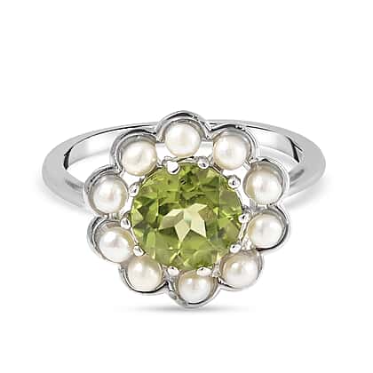 Natural Hebei Peridot and Freshwater Pearl Floral Ring in Rhodium Overlay Sterling Silver