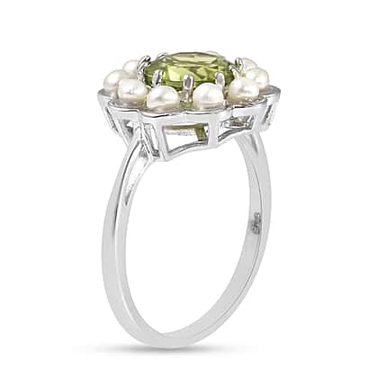 3 Ct. Hebei Peridot and Freshwater Pearl Floral Ring in Rhodium Plated Sterling Silver