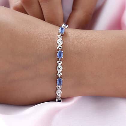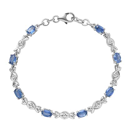 A tennis bracelet design is crafted by linking the oval links to form a bracelet. The bracelet is made of platinum plated sterling silver with Kyanite gemstone. The oval faceted gemstone is studded in a four-prong setting. The Kyanite is found in metamorphic rock in a blue hue. The bracelet is linked with gemstone and oval design platinum links alternatively. The bracelet comes in 7.5 inches size with a lock clasp.