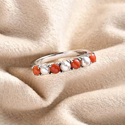 Natural Mediterranean Coral & Fresh Water Pearl Band Ring in Platinum Overlay Sterling Silver 1.04 Ct