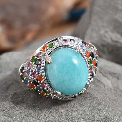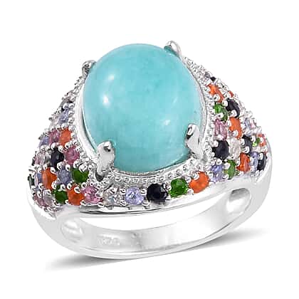 6.25 Ct Peruian Amazonite and Multi Gemstone Halo Ring in Platinum Plated Sterling Silver 6.19 Grams