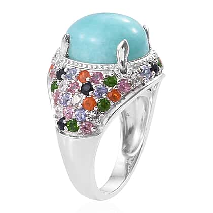 Natural Peruvian Amazonite (Ovl 12x10 mm), Tanzanite and Multi Gemstone Ring in Platinum Overlay Sterling Silver 6.250 Ct, Silver wt 5.29 Gms.