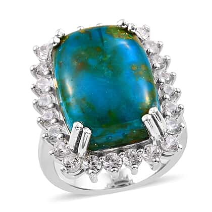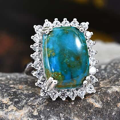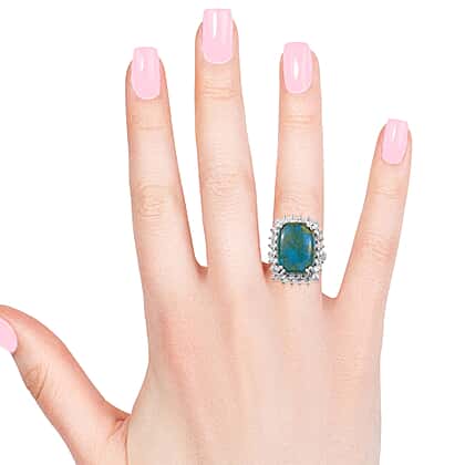 12 Ct Peruvian Peacock Opalina and Zircon Halo Ring in Platinum Plated Sterling Silver 6.95 Grams