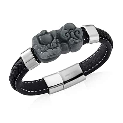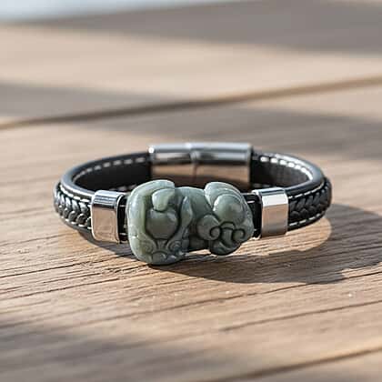 Natural Type A Jadeite with Pixiu Carving Leather Bracelet(Size 7.5) 125.00 Ct.