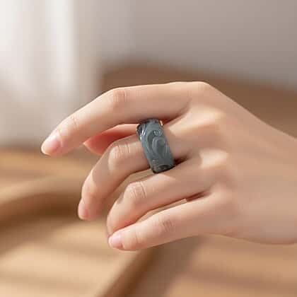 A stunning natural jade ring crafted from a single solid piece of stone, this design showcases a beautifully carved swirl that gives the piece a distinctive, artistic finish. The cool green tones and smooth, rounded shape create a bold statement while remaining comfortable for everyday wear. Each ring carries its own unique natural patterns, making it a standout addition for anyone who appreciates meaningful, character-rich jewellery with depth, presence, and traditional charm.