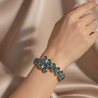 Inspired by the vivid tones of the sea, this bangle showcases pear-shaped blue glass stones that reflect a striking mix of turquoise and deep aqua hues. The colour play shifts beautifully with light, creating a lively and refreshing visual effect. Arranged in a rhythmic sequence, the stones form a continuous band of brilliance that enhances wrist presence without overwhelming. Set in a yellow gold-tone finish, the design adds warmth and contrast, making the blue tones appear even more vibrant. The adjustable style ensures ease of wear, offering both comfort and a secure fit for everyday styling or standout moments.