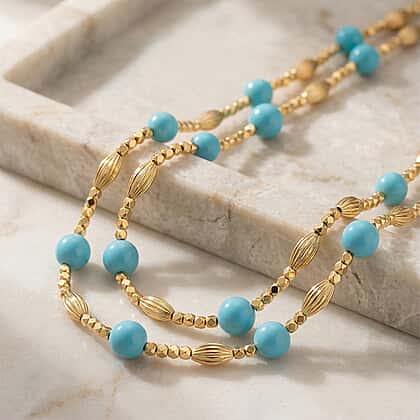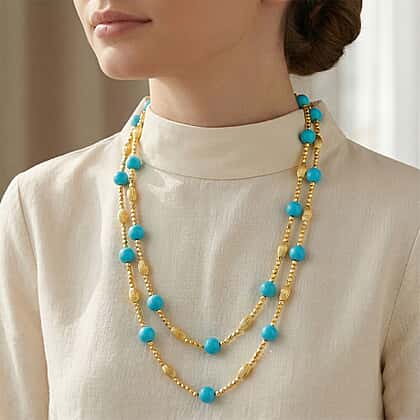 Bring a lively touch to your jewellery collection with this turquoise colour mother of pearl adjustable necklace, designed to create a layered and eye-catching look. The double-strand design pairs delicate gold-tone chains with evenly spaced beads, forming a balanced arrangement that sits neatly along the neckline. The coloured mother of pearl elements introduce a fresh, vibrant detail while maintaining a smooth, polished surface that reflects light softly. With its adjustable fastening, the length can be easily tailored to suit different styles, allowing it to complement both high neck and open neckline outfits. Lightweight and comfortable, this piece transitions effortlessly from everyday wear to more styled occasions.