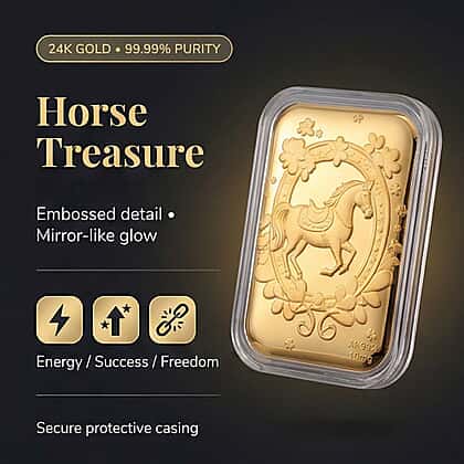 This gold collectible looks straight out of a fairytale. Crafted in pure 24K yellow gold, the bar features an embossed horse framed by delicate florals. It shows an artful blend of strength and grace. The high-polish finish makes the piece glow beautifully, while the protective casing keeps it pristine for years to come. Whether displayed on a desk, gifted as a keepsake, or added to a growing collection, it carries a quiet luxury that feels both timeless and modern.