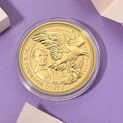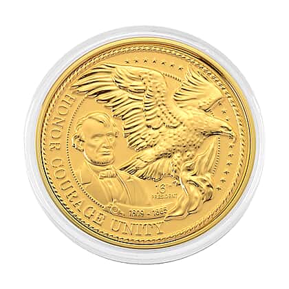 Measuring 6 cm in size, this striking piece highlights the powerful inscription: "Honor, Courage, Unity", underscoring Lincoln's enduring legacy and his role in preserving the nation. The highly reflective gold finish and fine craftsmanship make it a meaningful tribute to liberty and justice.