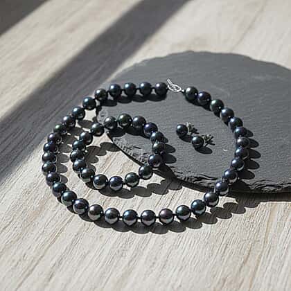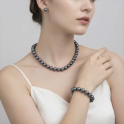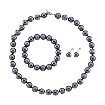 Set of 3 - Peacock Color Shell Pearl Stretchable Bracelet (Size - 7), Push Back Earring & T-Bar Clasp Necklace (Size - 20)