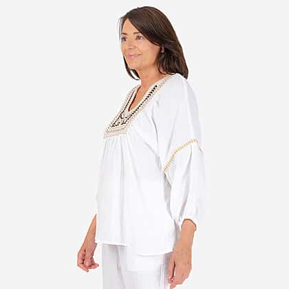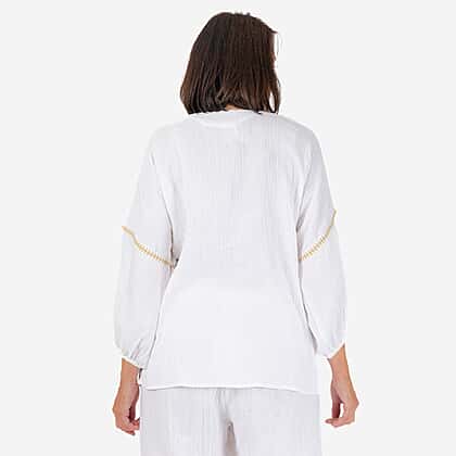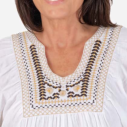 Discover effortless style with the Tamsy pure cotton embroidered gauze top. This versatile piece, made from 100% breathable cotton, offers a blend of comfort and elegance. The intricate embroidery adds a touch of sophistication, making it ideal for both casual outings and formal gatherings. The elastic sleeves provide a comfortable fit, while the 3/4 length sleeves and V-neck design enhance its timeless appeal. Perfect for any occasion, this woven top is your go-to for a polished look, whether you're heading to the office or out for a casual day.