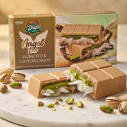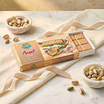 Savour the irresistible charm of Angel Hair Dubai Style Cotton Candy – Brown, a confection that captures the essence of Middle Eastern indulgence. Each handmade 172g bar blends silky milk chocolate with airy cotton candy and creamy pistachio filling, creating a perfect harmony of texture and flavour. Made with authentic ingredients and wrapped in elegant packaging, it’s a treat designed to impress. Whether you’re gifting or simply indulging in a little luxury, this delightful creation offers a taste of Dubai’s sweetest artistry with every bite.