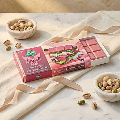 Delight in the exotic taste of Angel Hair Dubai Style Cotton Candy – Pink, where luxury meets indulgence. Handmade with layers of soft, cloud-like cotton candy and rich pistachio cream, it’s wrapped in the finest Belgian chocolate for an unforgettable bite. Each 172g bar is beautifully gift-ready, making it perfect for sharing or savouring solo. Inspired by Dubai’s vibrant dessert culture, this fusion of sweetness and crunch delivers a taste that’s both nostalgic and modern. Treat yourself or surprise someone special with this truly unique creation.