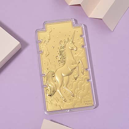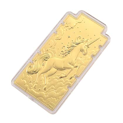This 24K gold embossed foil presents a majestic unicorn rising through soft clouds and scattered stars, creating a scene filled with fantasy and symbolic charm. The raised artwork brings depth and movement, highlighting the flowing mane, lifted posture and graceful stance. The warm gold tone adds a rich glow suited for collectors, gifting or display. Fine detailing across every curve gives the piece a sculpted, luxurious presence. This foil offers a meaningful keepsake for those who appreciate mythical creatures and imaginative design.