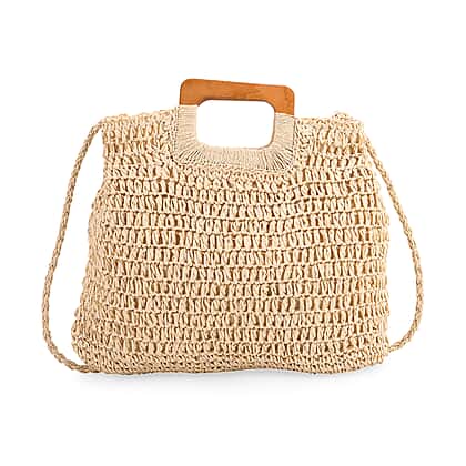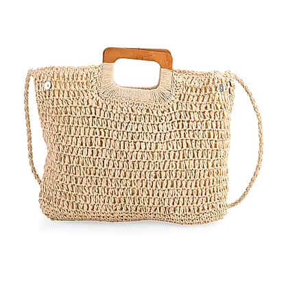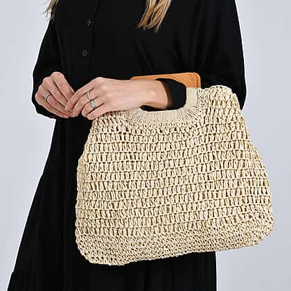 Bohemian Straw-Style Tote Bag with Top Handles - Beige
