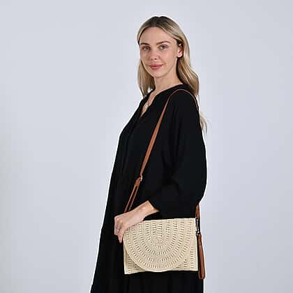 Bohemian Style Woven Clutch with Long Adjustable Strap - Beige