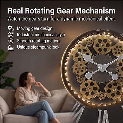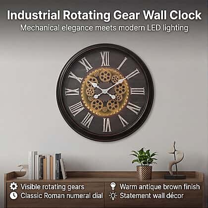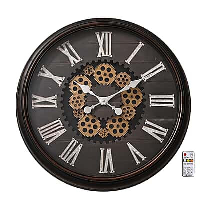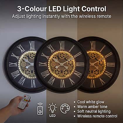 Rotating Gear LED Wall Clock with 3-Colour Wireless Light Control - Brown