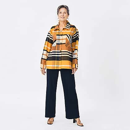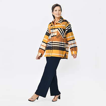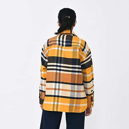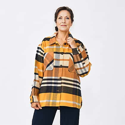 Refresh your layering style with the TAMSY cotton checkered shacket, a versatile addition to your casual wardrobe. Crafted from 100% cotton, this shacket feels wonderfully soft and offers all-day comfort. It features an attractive beige and black yarn-dyed check pattern, complemented by a classic collar and horn buttons for an iconic look. Two practical front pockets enhance its casual appeal, perfect for carrying small essentials. Ideal for cooler days, this shacket effortlessly transitions between seasons. Wear it buttoned up or open over your favourite top, pairing easily with jeans or trousers for a relaxed yet polished outfit.
