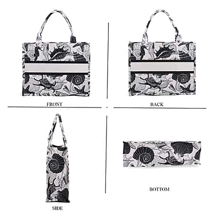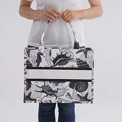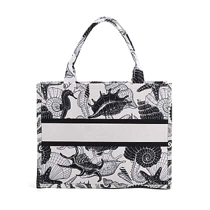Nautical Print Linen Tote Bag with Seahorses & Shells - Black & White