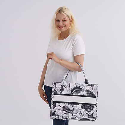 Bring coastal charm to your everyday routine with this nautical print linen tote bag, featuring a striking black seahorse pattern on a crisp white base. Crafted from breathable linen with a sturdy polyester lining, it’s both stylish and practical. With a spacious 43x16x35cm size, it comfortably holds all your daily essentials. A secure top zip keeps everything safe, while zipped pockets inside and out help you stay organised. The 20cm handle drop allows for a relaxed shoulder carry, and the metallic hardware and nylon zip add a polished finish. Perfect for beach days, markets, or casual outings.
