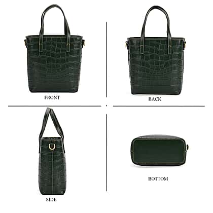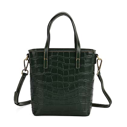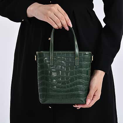 Step out with confidence, carrying this green crocodile-patterned embossed leather bag, crafted to elevate your style with effortless flair. The genuine leather finish gives it a luxurious texture, while the deep tone offers timeless appeal. Designed for versatility, it can be worn crossbody or carried by hand thanks to its detachable strap and structured handles. Inside, a soft polyester lining with zipped storage keeps everything neatly in place. Elegant, durable, and modern – the perfect go-to piece for daily wear.