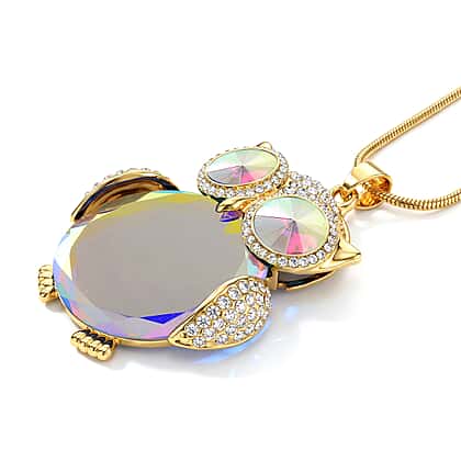 Turn attention your way with this owl-inspired crystal pendant, designed to captivate through light, detail, and shifting colour. At its centre sits a smooth, rounded stone that reflects a spectrum of soft tones, changing subtly as it moves. Surrounding it, smaller crystals shape the owl’s eyes and wings, creating a layered composition that feels intricate without becoming overwhelming. The yellow gold tone setting adds warmth and depth, balancing the luminous quality of the stone while enhancing its colour play. Delicate accents along the wings introduce a gentle sparkle, giving the piece dimension from every angle. Suspended from a fine chain, the pendant rests neatly along the neckline, with an adjustable extension that allows you to style it to suit different looks. A piece that invites closer attention, this necklace brings a sense of character, light, and quiet intrigue into your jewellery collection.