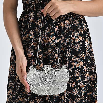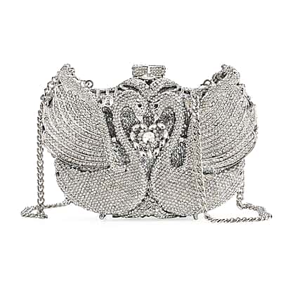 CLOSE OUT DEAL - Crystellia Swan Pattern Premium Austrian Crystal Clutch Bag - Silver