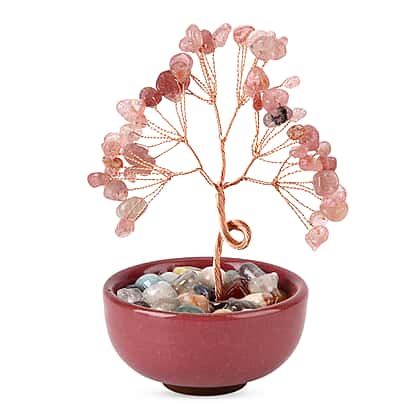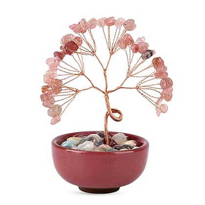 Feng Shui Strawberry Quartz Crystal Money Tree Ornament with Ceramic Pot (11cm) - Rose Red