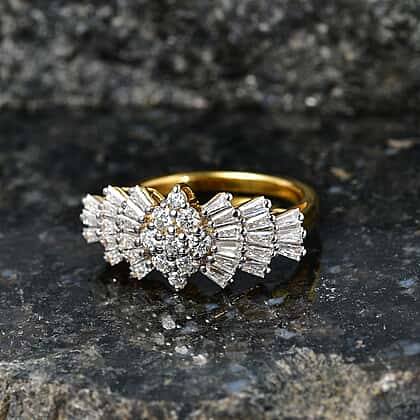 Make every gesture unforgettable with a ring that’s designed to shine from every angle. At the centre, a cluster of sparkling moissanite stones forms a captivating focal point, while the surrounding tapered baguette-style stones fan outward in a ballerina-inspired arrangement. This layered design creates depth, movement, and a dramatic burst of light that catches attention effortlessly. Set in 18K vermeil yellow gold plating on 925 sterling silver, the ring offers a warm finish with a yellow toned polish that enhances the clarity and sparkle of each stone. The structured setting adds presence on the finger, making it feel substantial. This moissanite ballerina ring brings together bold brilliance and intricate design, creating a look that instantly stands out. Perfect for special occasions or when you want to elevate your everyday style, this piece delivers statement glamour with a refined edge.
