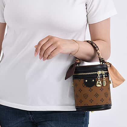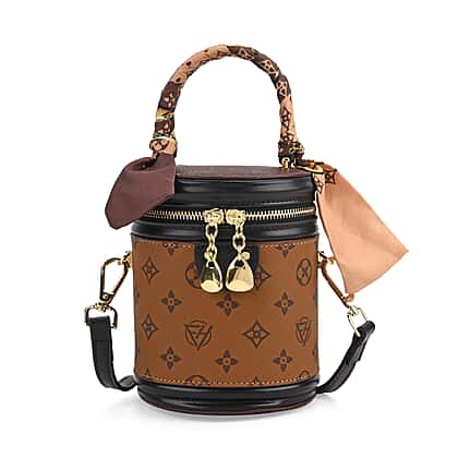 Designer Inspired - Two Tone Crossbody Scarf Bucket Bag with Detachable Shoulder Strap - Brown & Black