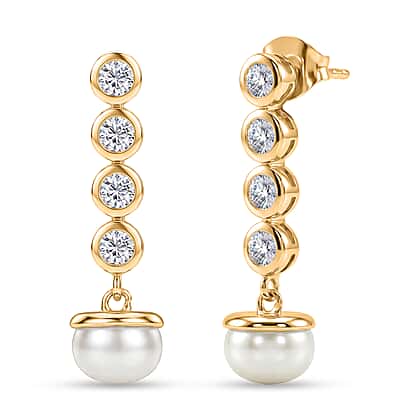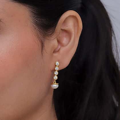 D'Joy - Moissanite & Fresh Water Pearl Dangling Earring with Push Back in Yellow Gold Plated Sterling Silver 5.60 Ct.