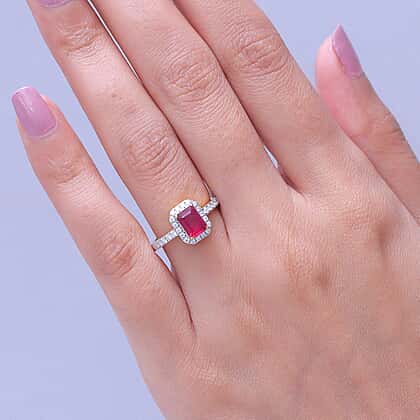 Introducing a radiant statement of colour and brilliance, this ring features a striking emerald-cut African ruby framed by a luminous halo that amplifies its rich red intensity. The clean, geometric lines of the centre stone create a bold focal point, while the surrounding moissanite accents add a refined shimmer that enhances every angle. Set on a sleek band adorned with delicate stones, the design balances strength with sparkle, allowing the ruby to command attention without overwhelming the overall composition. Finished in 18K vermeil yellow gold plating on 925 sterling silver, the warm tone deepens the richness of the gemstone while adding a polished, high-end finish. This piece delivers a confident, standout look with a refined edge.