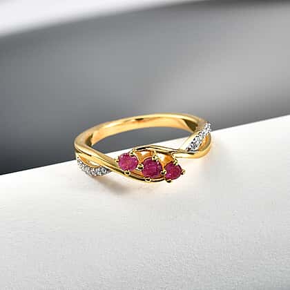 Make a statement of enduring love with this D'Joy trilogy ring from the Royal Bali Collection. this beautiful ring showcases three captivating African rubies, framed by glimmering moissanite stones. The trilogy design represents past, present, and future, making this piece a perfect symbol of lasting love and commitment. Crafted in 18K vermeil yellow gold plating on 925 sterling silver, this ring ensures lasting shine and durability. Its luxurious finish and exquisite detailing make it an ideal gift for engagements, anniversaries, or as a statement piece to be treasured for a lifetime.