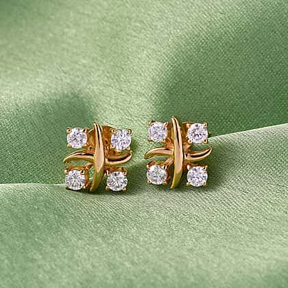 A distinctive cluster design gives these moissanite stud earrings their structured brilliance and contemporary appeal. Multiple brilliant moissanite stones are arranged to create depth and eye-catching sparkle from every angle. Crafted in yellow gold plating on 925 sterling silver, the warm polished finish enhances the radiance of each stone while adding rich contrast. The compact stud silhouette makes them easy to style for daily wear as well as special occasions. Secured with push back fastenings, these earrings offer comfort, shine and confident styling.