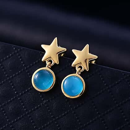 These stunning dangling earrings feature vibrant paraiba moonstones, framed by a playful star design. The star design is seen as a beacon of lighting, guiding the wearer in their journey. The smooth blue moonstone contrasts beautifully with the star-shaped top, creating a striking and whimsical design. Meticulously crafted in yellow gold plating on 925 sterling silver, these earrings ensure durability and luxurious appeal. Finished with a secure push post closure, this offers secure wear and a comfortable fit. Perfect for adding a pop of colour and sparkle to any outfit, these earrings combine sophistication with a touch of fun. Ideal for those seeking a unique, eye-catching accessory, they stand out while remaining versatile enough for everyday wear or special occasions.