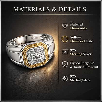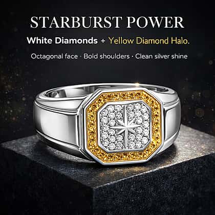 Layers of shine come together beautifully in this natural white diamond men's starburst ring. The geometric face features a bright starburst centre crafted from robust white diamonds known for their rare clarity and natural fire. A frame of yellow diamonds adds warmth and contrast, making each stone feel intentional and bold. The band is crafted from hypoallergenic, tarnish-resistant sterling silver, offering a smooth feel for daily wear. The angular profile adds strength to the design, creating a piece that celebrates confidence, precision and a love for standout detail.