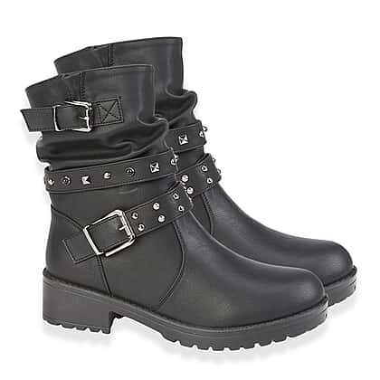 Give your outfit a bold upgrade with the Emma Antonia ankle boots in classic black. Crafted from soft PU with a sturdy sole, these biker-inspired boots blend comfort and style effortlessly. The edgy studded straps and double buckle detailing add attitude, while the slightly wider top ensures a relaxed fit around the calf. Finished with a chunky heel for extra support, they’re ideal for pairing with jeans, leggings, or dresses – perfect for everyday wear with a fashionable twist.