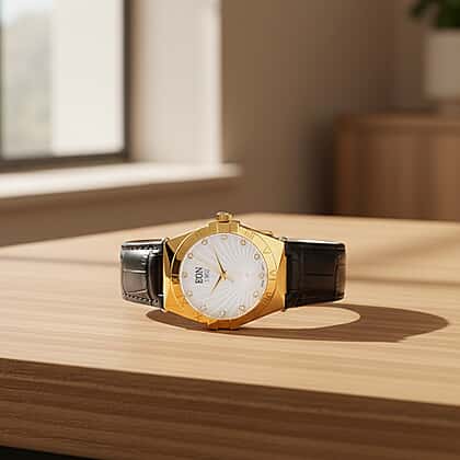 EON 1962 Ronda 763 Swiss Quartz 5ATM WR White Hydraulic & Diamond Dial & Gold Case Ladies Watch with Black Leather Strap