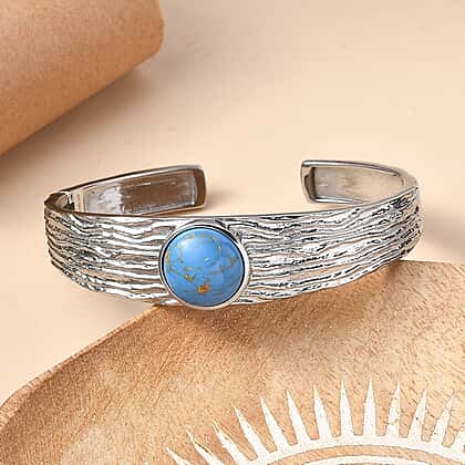 Adorn your wrist with this turquoise cuff bangle, designed to highlight bold texture and striking colour contrast. Known for its vibrant hue and timeless appeal, turquoise adds a refreshing pop of colour that instantly draws attention. The wide band features a layered, wood-inspired surface that adds depth and a tactile feel across the design. At the centre, a vivid turquoise stone creates a strong focal point against the cool-toned metal. The open cuff structure ensures easy wear while maintaining a clean, structured shape, making it a versatile addition to your jewellery collection.