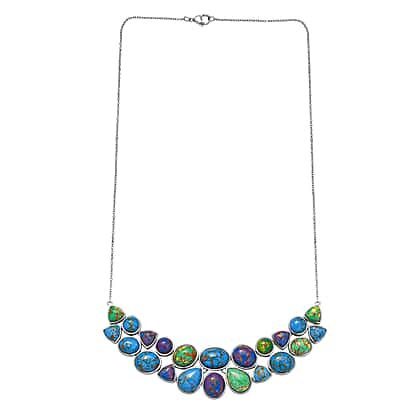 A vibrant sweep of multi-colour mojave turquoise stones forms a striking cluster across the neckline, symbolising protection and good fortune. The mix of oval, round and teardrop shapes creates a flowing, sculptural layout that sits beautifully once worn, with every stone framed in cool platinum overlay to enhance the multi-colour tone. A polished silver-toned finish keeps the look refined while allowing the vivid multi-colour to remain the focal point. The necklace brings colour, character, and a statement presence, making it a standout piece for anyone who appreciates bold gemstone artistry.