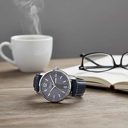 GENOA TIME V2 Double Date Quartz PC33 3ATM WR Blue Hydraulic Dial & Silver Case Mens Watch with Blue Leather Strap